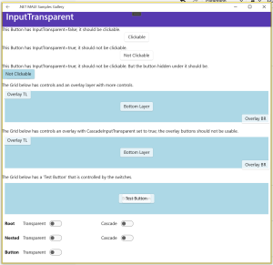The Grid below has controls an overlay with CascadeInputTransparent set to true; the overlay buttons should not be usable.